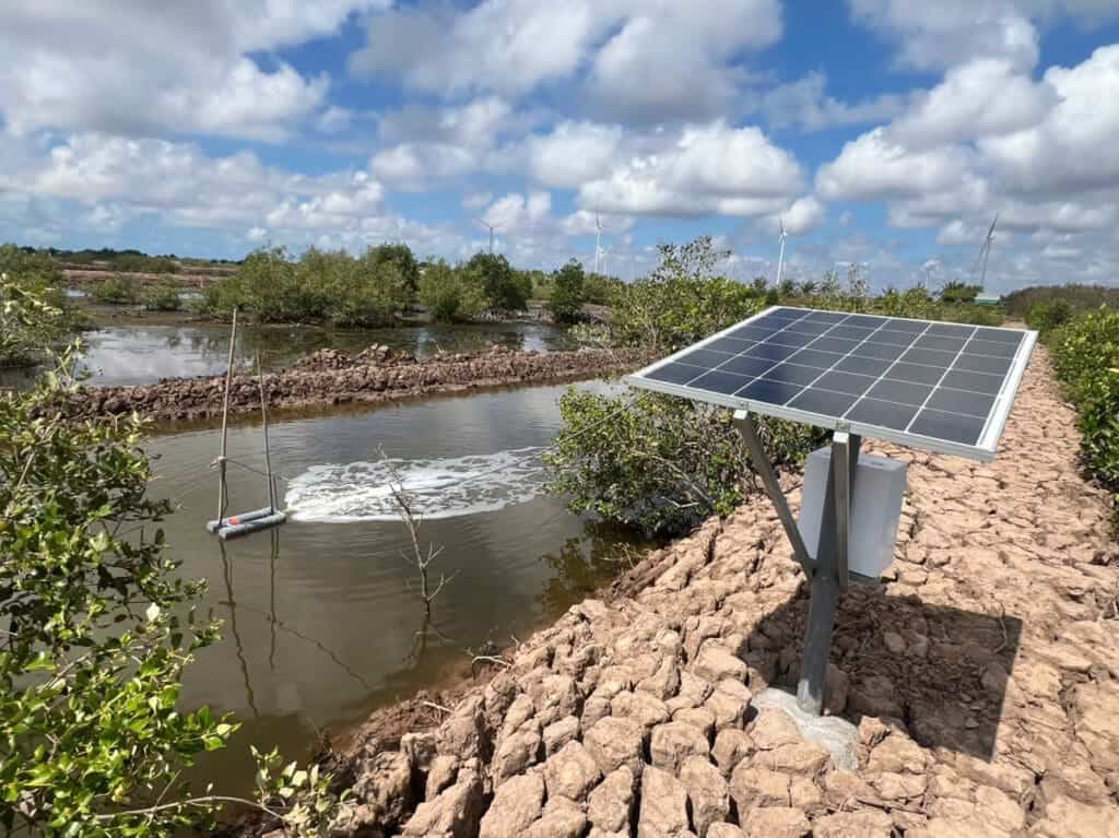 To address these dangers to coastal livelihoods and mangrove environments, IUCN has been working with local communities and shrimp farmers to implement Nature-based Solutions (NbS) that promote sustainable production and coastal resilience. The IUCN-US grant funded project, Increasing coastal resilience in the Mekong Delta through Mangrove Restoration and Hybrid Nature-based Solutions, aims to both restore mangroves and integrate sustainable aquaculture practices. The project has two primary objectives: 1) mangrove restoration behind sea dykes to reinforce natural coastal defenses and 2) introduction of Recirculating Aquaculture Systems and Integrated Multi-Trophic Aquaculture (RAS-IMTA) to improve the sustainability and efficiency of shrimp and aquatic farming.