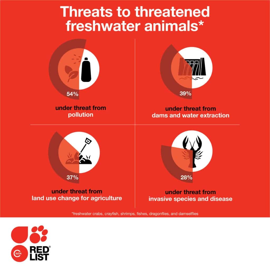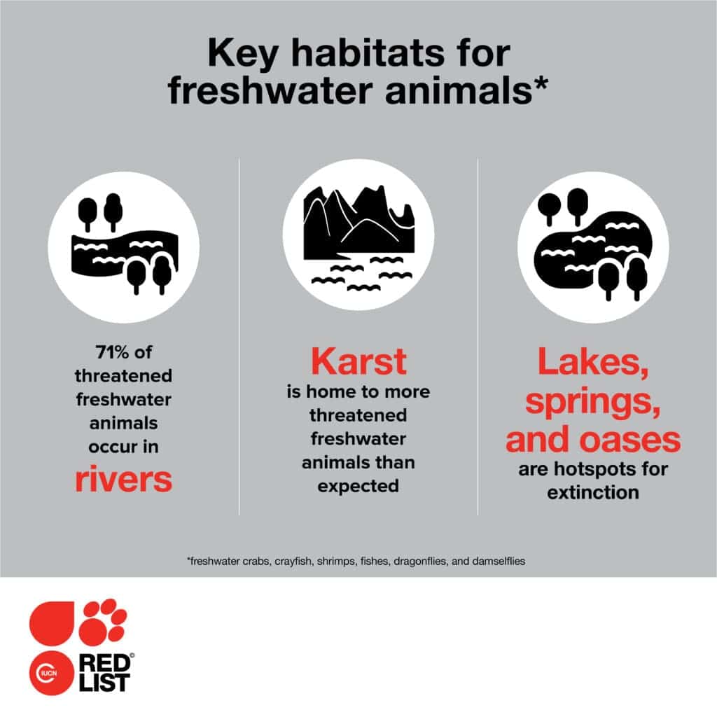 The freshwater species assessment made novel findings that will be of substantial use for freshwater conservation planning, including the assessment that one-quarter of freshwater species, including crabs, crayfish, fish, and odonates (i.e. dragonflies), are at high risk of extinction. The assessment was conducted through the IUCN Red List of Threatened Species, the world’s leading metric for species risk assessment.